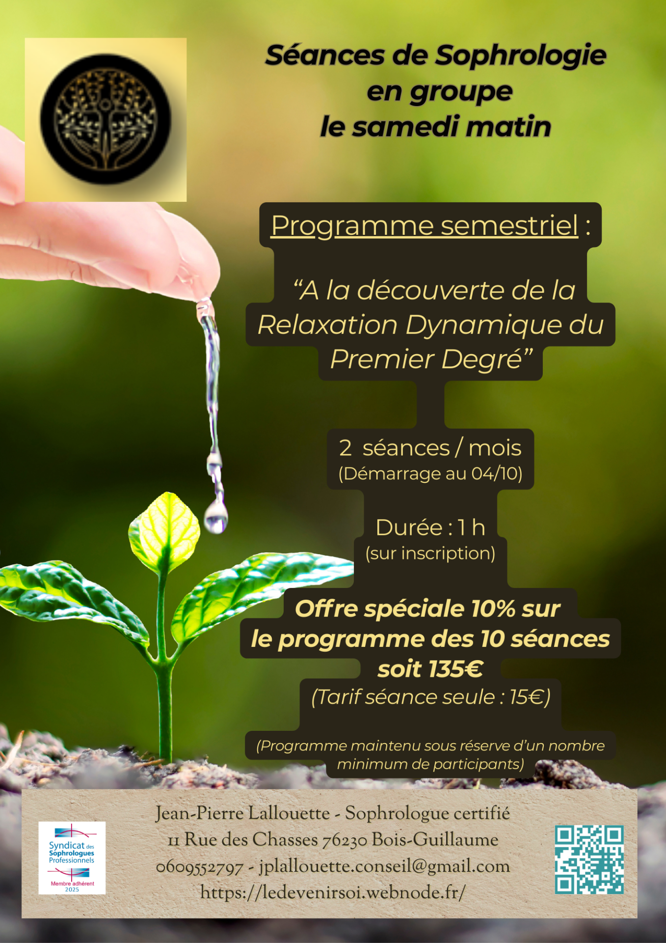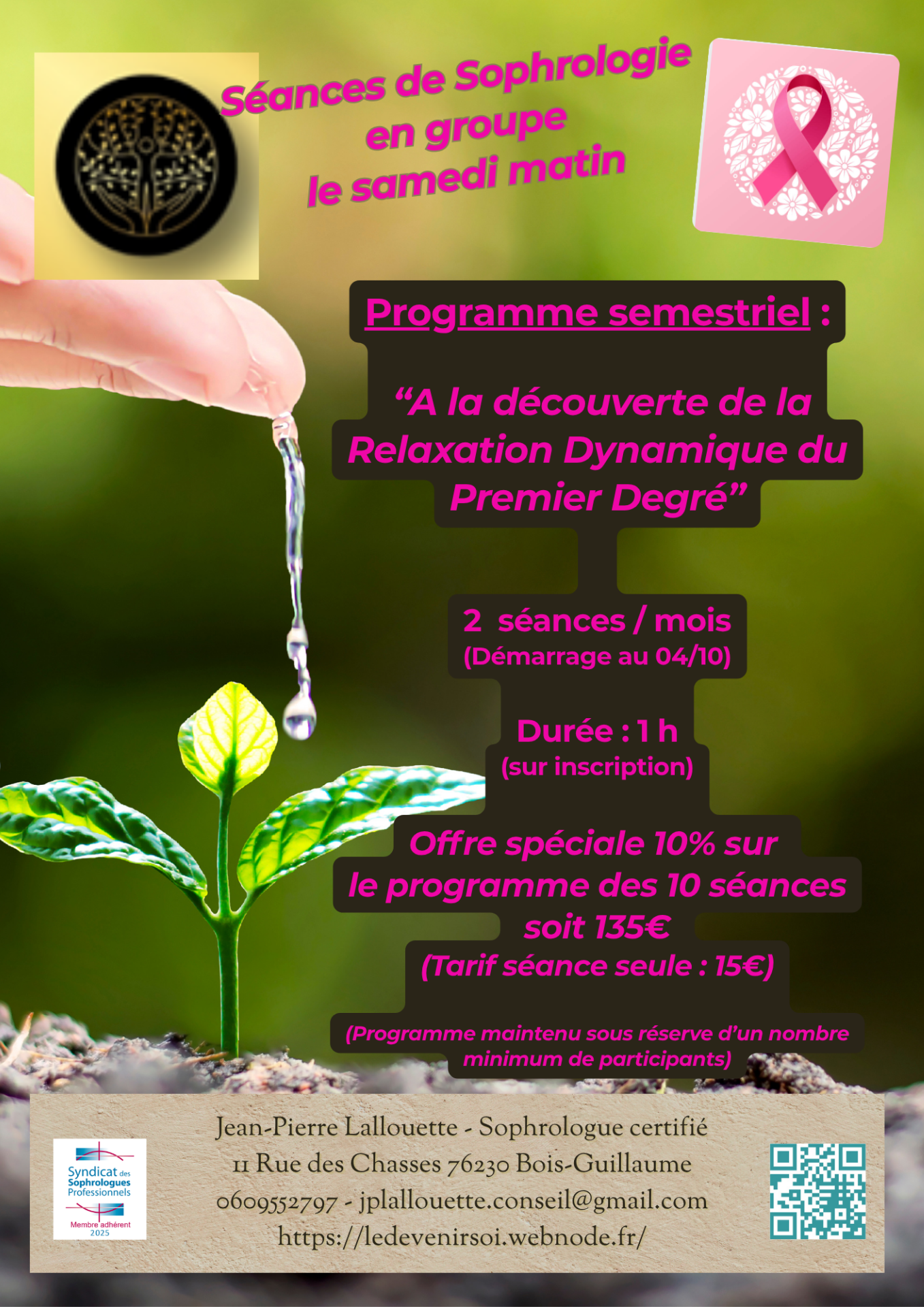 02/10/2025 : Prendre le temps de prendre judicieusement soin de soi, de ralentir le temps d'une pause dans le devenir de soi vers un mieux-être, dans l'équilibre et l'harmonie. La sophrologie en groupe et/ou en séances individuelle est-là pour vous y accompagner. Il reste des places.