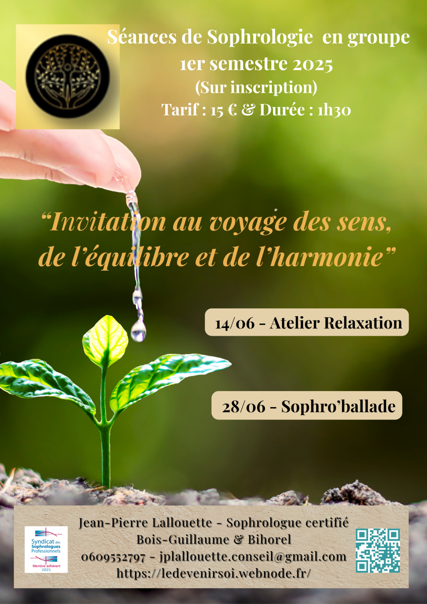 Je vous invite à venir découvrir la sophrologie. Il reste quelques places.